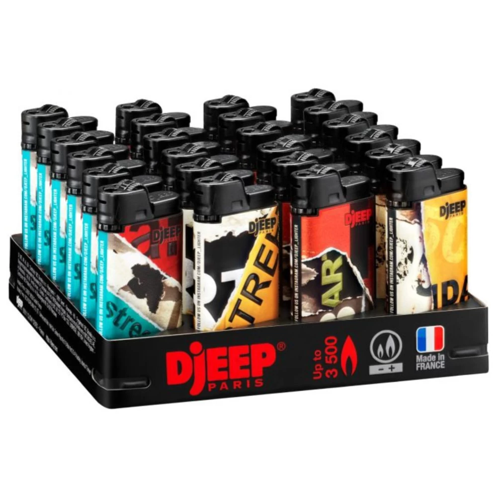 Les briquets Djeep possèdent une silhouette originale. Large et fin, ces briquets premium sont fabriqués en France. Découvrez une plaquette de 24 briquets assortis de la collection « Ripped Paper », avec des designs de papiers déstructurés. Environ 6 x 3.5 cm, décors uniques grâce à une combinaison de matières avec des parties holographiques