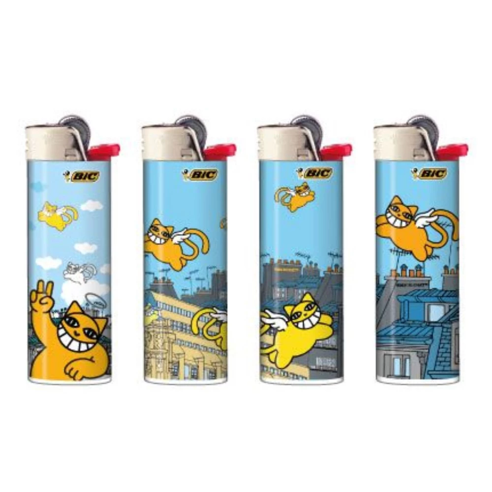 Barquette de 50 briquets BIC J26 Maxi avec des illustrations aux motifs de Chats sur des Toits. Briquets à pierre et à gaz, 4 modèles différents