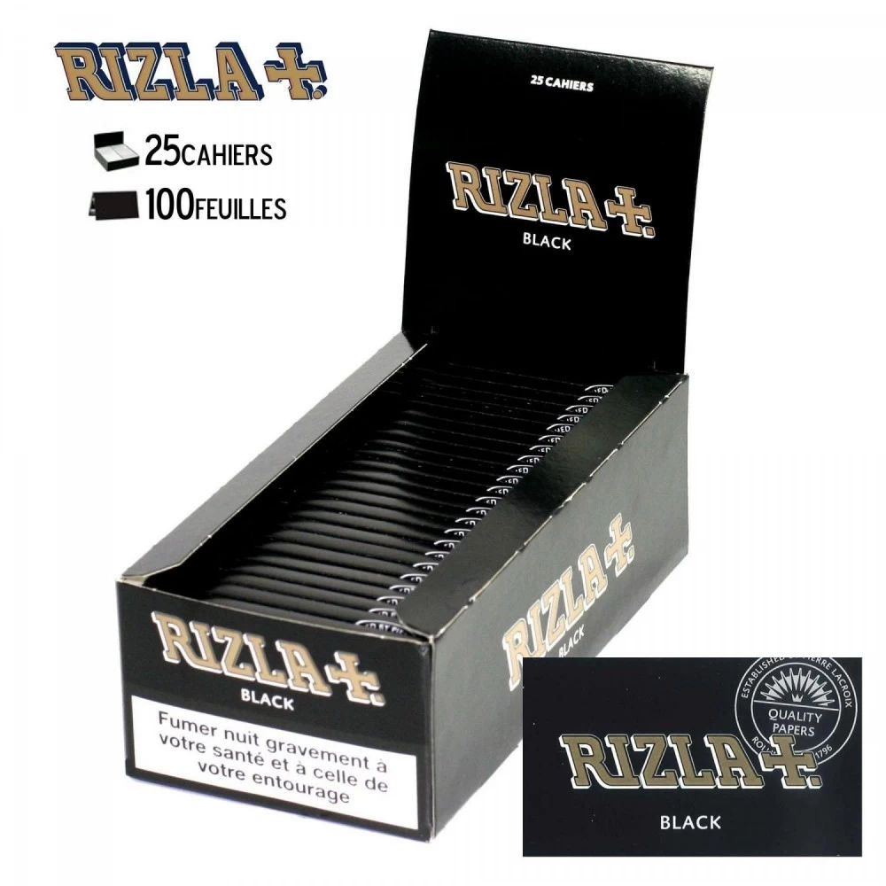 En vente sur le site 25 cahiers de 100 feuilles de papier à rouler Rizla black petit format.