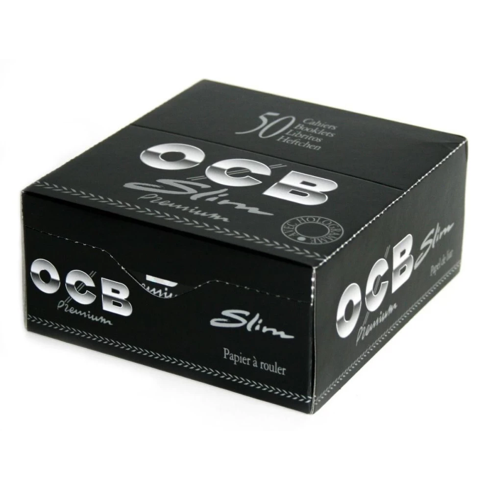 Boite de 50 cahiers de 32 feuilles de papier Ă cigarettes OCB SLIM Premium.