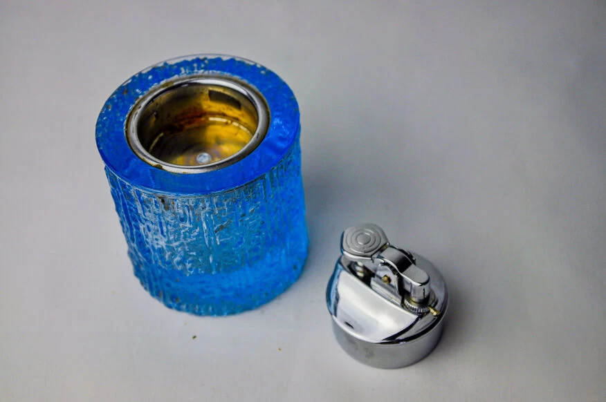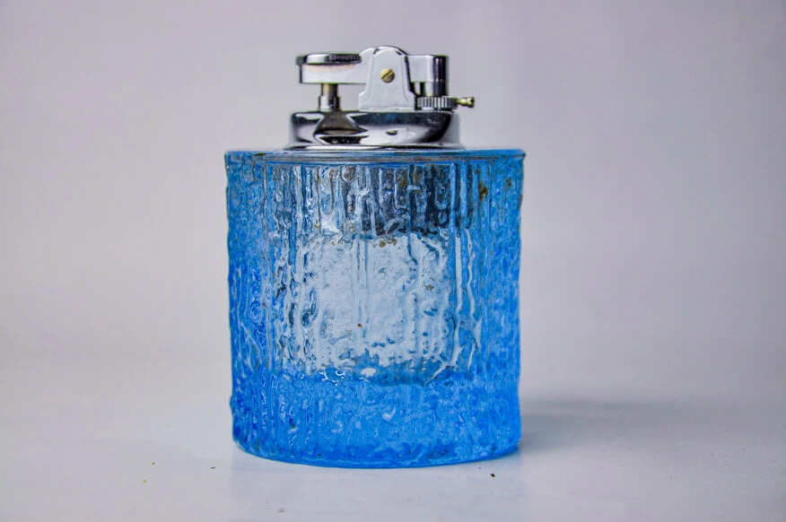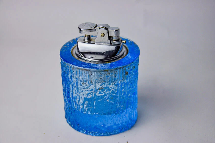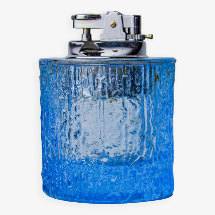 Briquet en verre de murano bleu avec un effet loupe sur ses facettes, produit artisanalement par les maîtres verriers vénitiens.