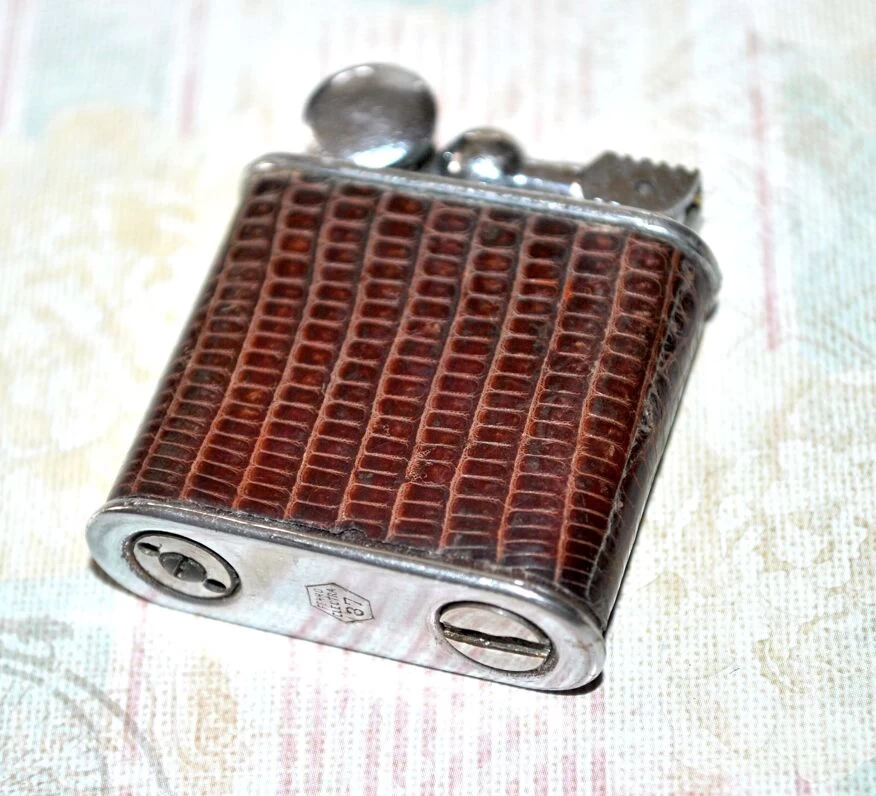 Cet ancien briquet vintage est gainé de peau de serpent.