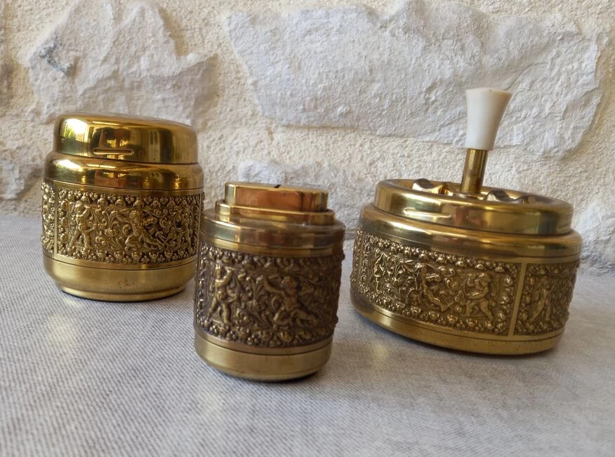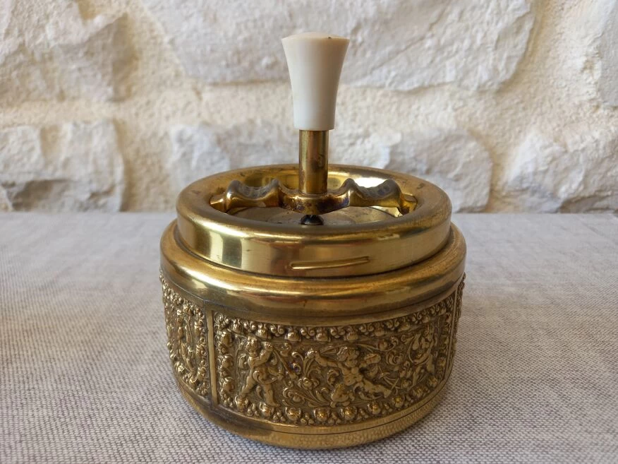 Cendrier, briquet (à recharger) et boîte à cigarette de la marque roulette ashtray.