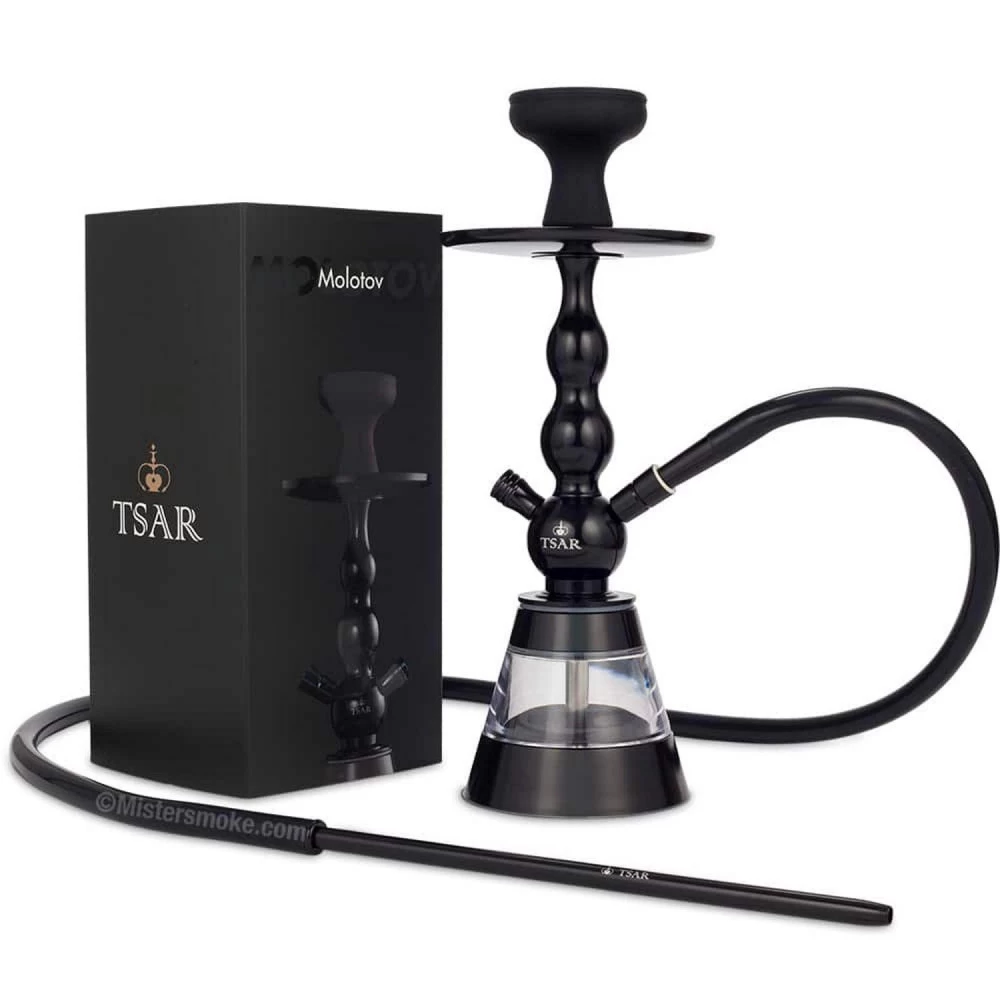 La Chicha TSAR MOLOTOV noire mesure 40 cm et se compose d’un vase aluminium noir et d’une cuve acrylique surmonté d’un manche et d’une assiette en aluminium. Le foyer est incassable puisque en silicone de type phunnel. Il vous sera également fourni un tuyau silicone et une pince à charbon. La chicha TSAR MOLOTOV est prête à l’emploi.