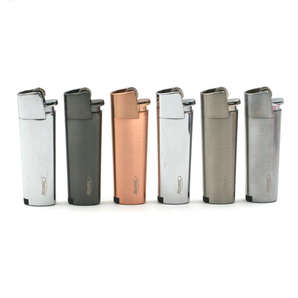 Sur ce présentoir retrouvez 6 Briquets effet métal avec plusieurs coloris et 6 Briquets colorés avec effet pailleté métallisé (Bleu, Rouge, Jaune, Rose fluo, Orange fluo, Vert fluo). Ces Briquets de la marque Atomic sont rechargeables et la flamme réglable avec une molette située au bas du briquet.