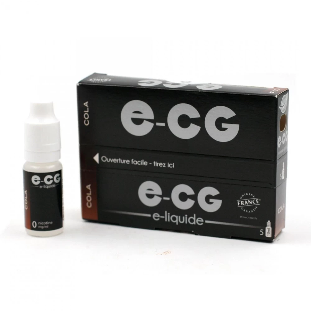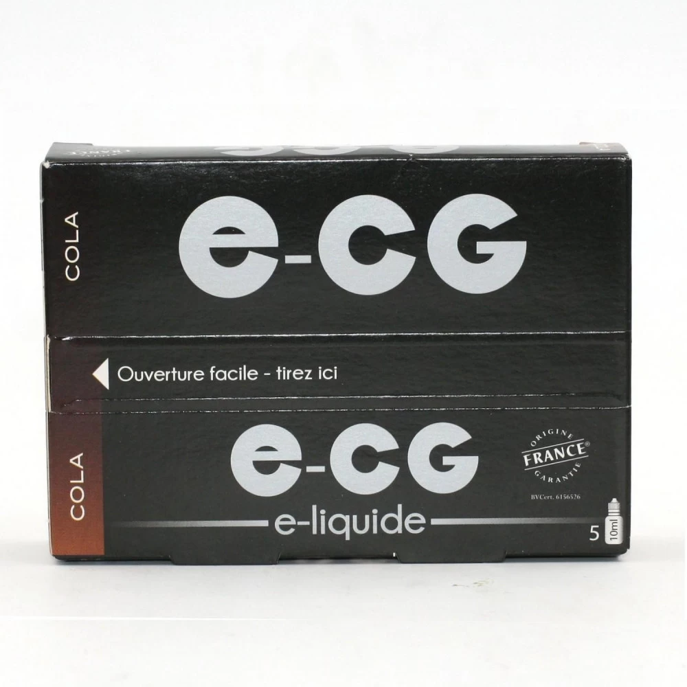 Lot de 5 Flacons E-CG – Cola 0 mg/mlFlacon de 10 mlComposition : 75 % de propylène glycol et 25 % de glycérine végétale, arômes naturels.