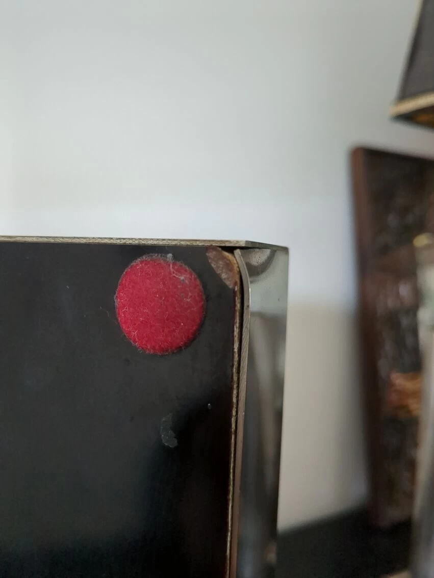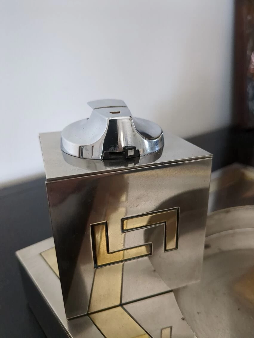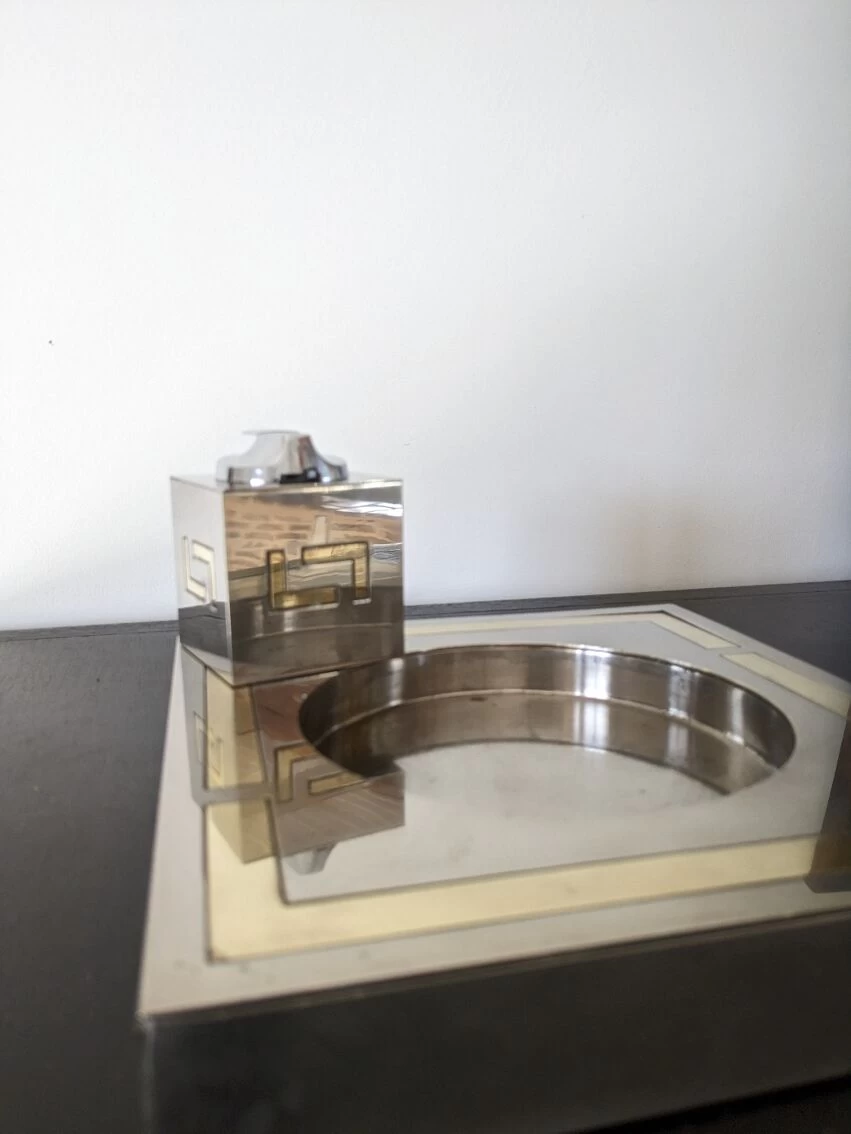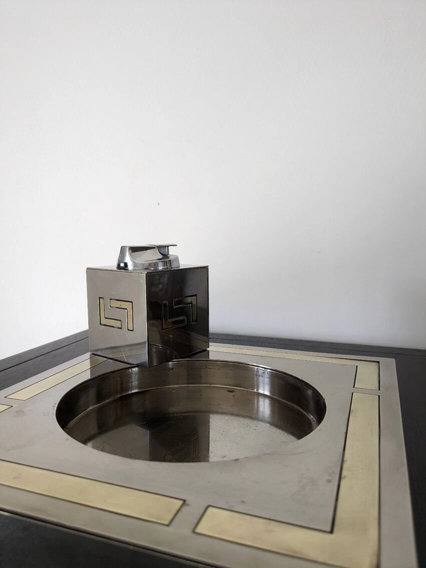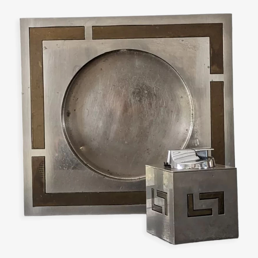 Nécessaires de fumeur cendrier et briquet de table inox et incrustation de laiton design moderniste années 70.