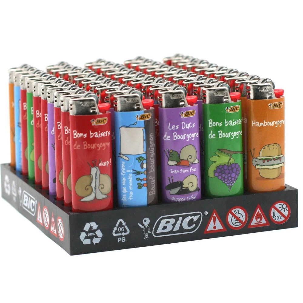 Plaquette complète avec 50 briquets BIC J26 (grand format) sur le thème de la Bourgogne. Avec 5 modèles différents comprenant chacun une illustration humoristique sur la vie en Bourgogne. Venez découvrir cette collection et ses illustrations aussi drôles que colorées !